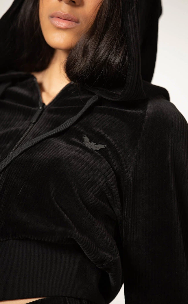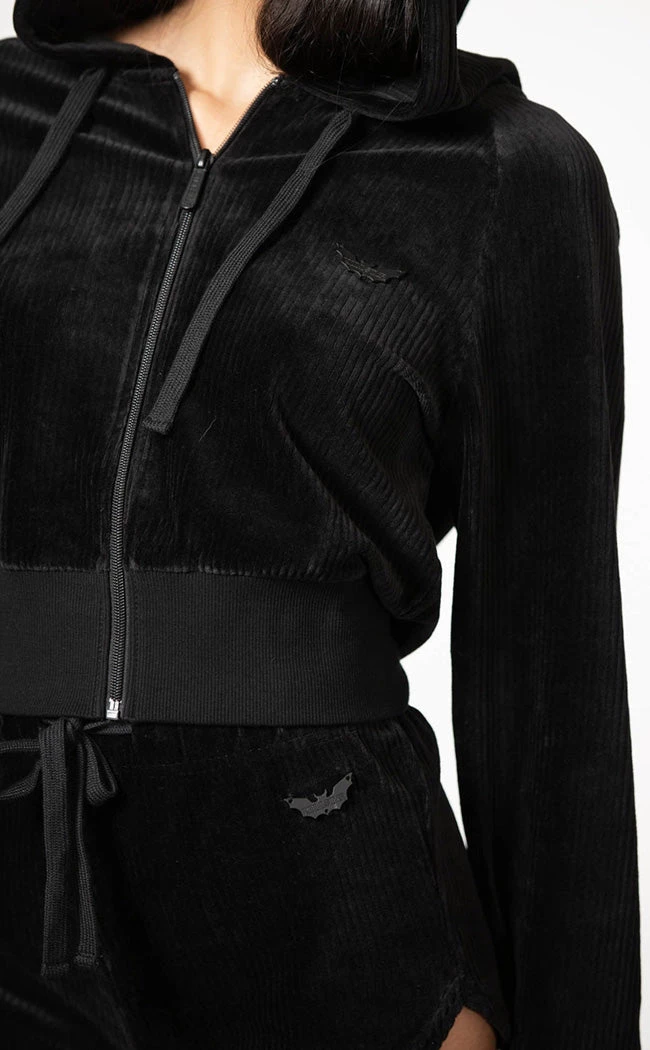 Get creepy cosy in the Eternal Rest Zip Hoodie! Black ribbed velour forms a cropped silhouette, featuring a large hood, cuffed sleeves, and a metal bat emblem on the chest. A cosy casual piece as black as your soul!