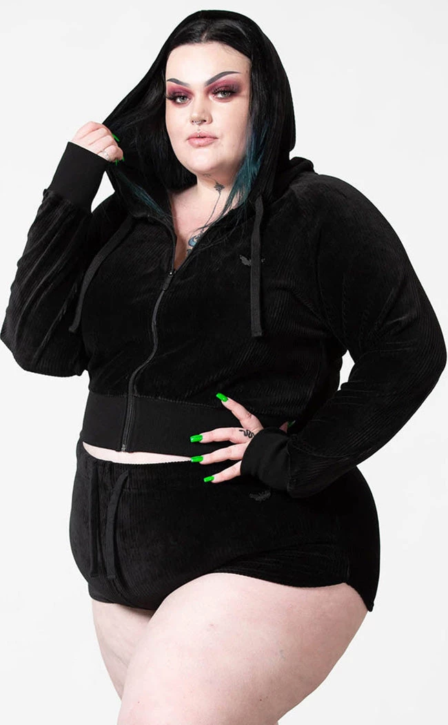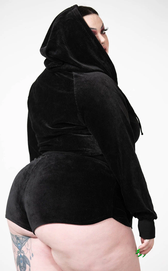 Drape yerself comfortably over yer crypt in the Laid To Rest Shorts! Formed from soft ribbed velour, these shorts sit high on the waist with an elasticated band and drawstring for a secure and cosy fit. A metal bat emblem on the hip is the spooky cherry on top.