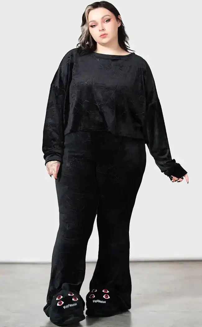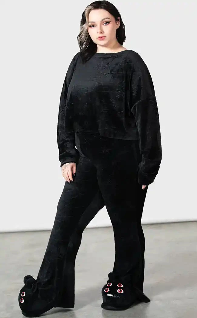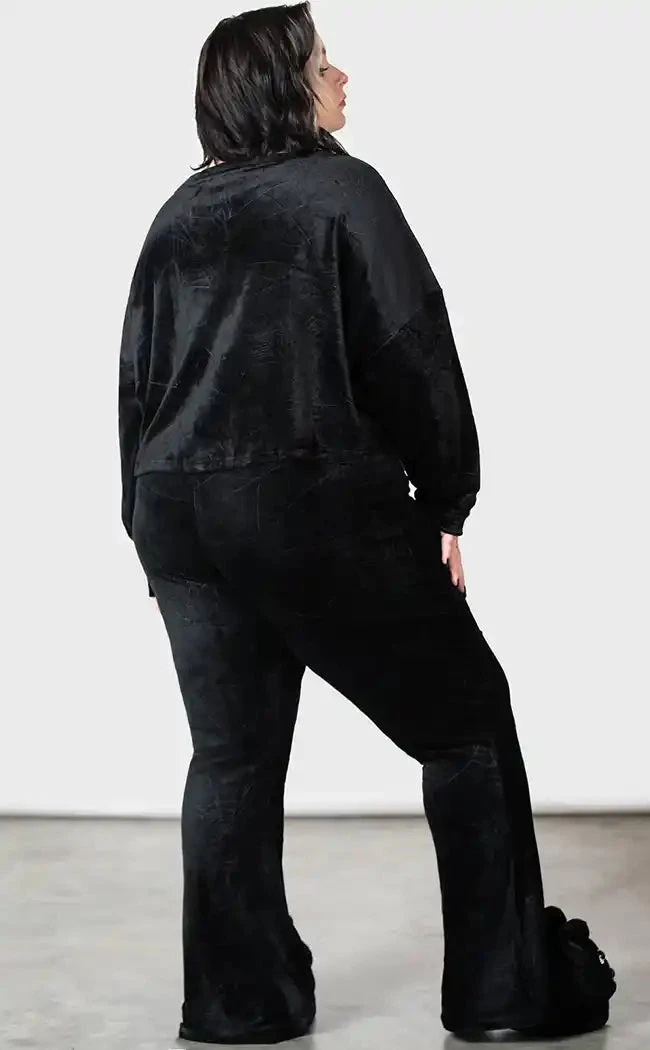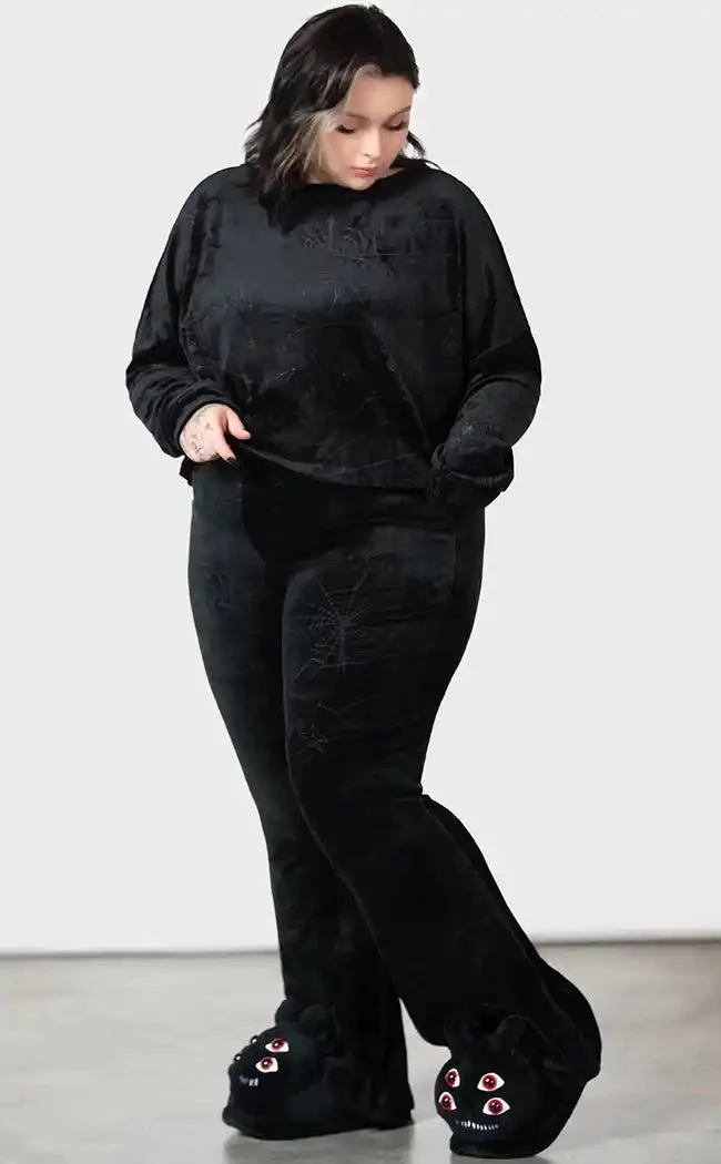 The Lulluspider Flares will have you lounging in lethal luxury! Formed from deliciously soft velour with an embossed spiderweb design, these flares are fitted with an elastic waistband for the most comfortable fit.