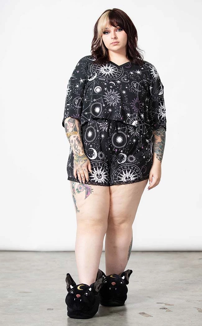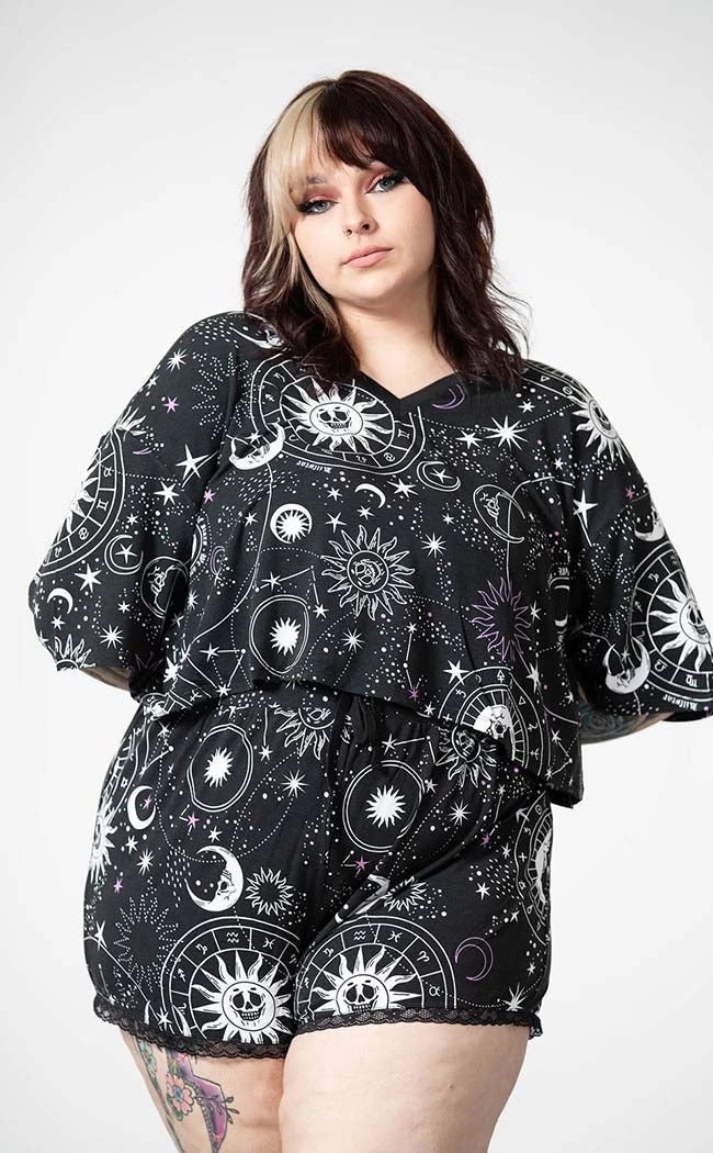 Glow up while you snuggle up in the Moonlight V Neck Crop Top! The fabric is super soft and stretchy, printed all over with a wicked cosmic pattern. Feel at ease in the relaxed fit, featuring a V-neckline and elbow-length sleeves.