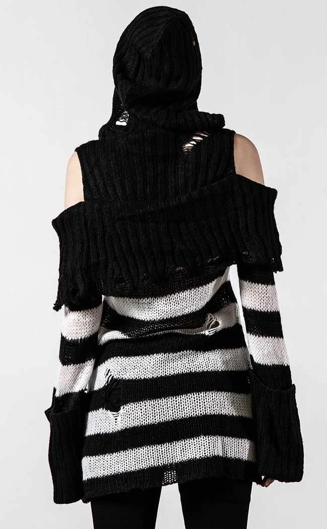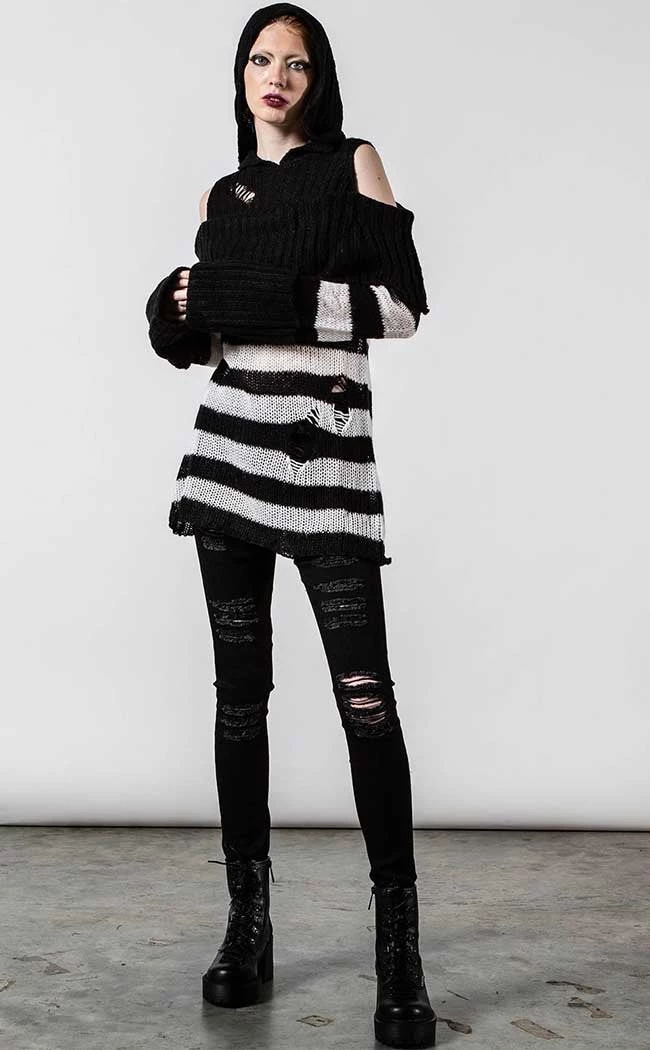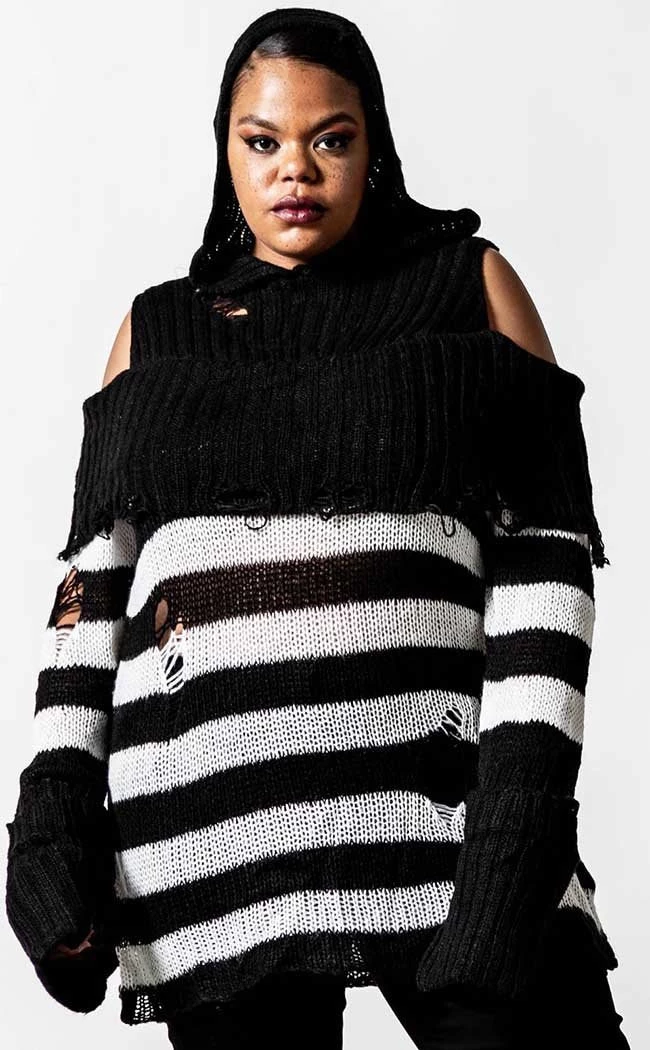 Get snug in ghostly stripes with the Poison Hooded Knit Sweater. Super soft and totally vegan, this knit wraps you in a statement bardot neckline and cosy hood. TheΒ white and black stripes feature shredded details to get ya feeling extra badass, fitting over yer bod in effortless warmth and style.Β