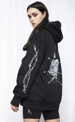 The Rogue Masked Hoodie will have you looking like a goth assassin! Super soft fabric forms long sleeves, an oversized hood and an exaggerated collar that can be pulled around the face as a mask. Hardware details including a full-length zip and chains complete the look.