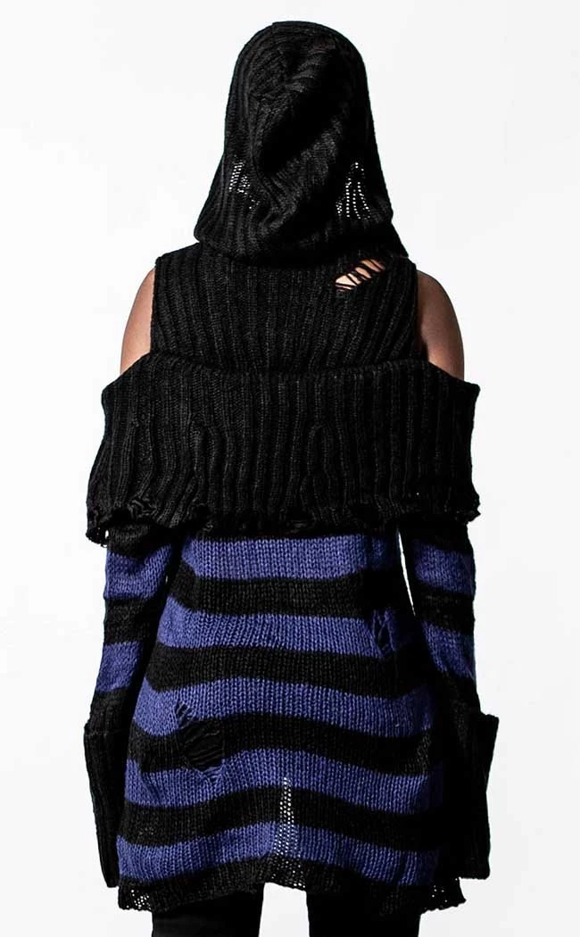 Get snug inΒ inky stripes with the Sapphire Hooded Knit Sweater. Super soft and totally vegan, this knit wraps you in a statement bardot neckline and cosy hood. TheΒ blue and black stripes feature shredded details to get ya feeling extra badass, fitting over yer bod in effortless warmth and style.Β
