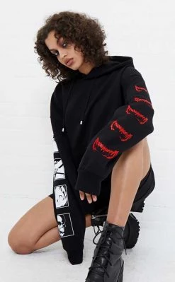 Dress to kill in the Troublemaker Cropped Hoodie! This statement hoodie features an oversized hood printed with statement designs on the inside to match the long sleeves. The front features two statement straps hanging from a pentagram charm that sits above the cropped chest.