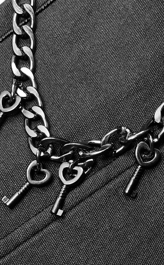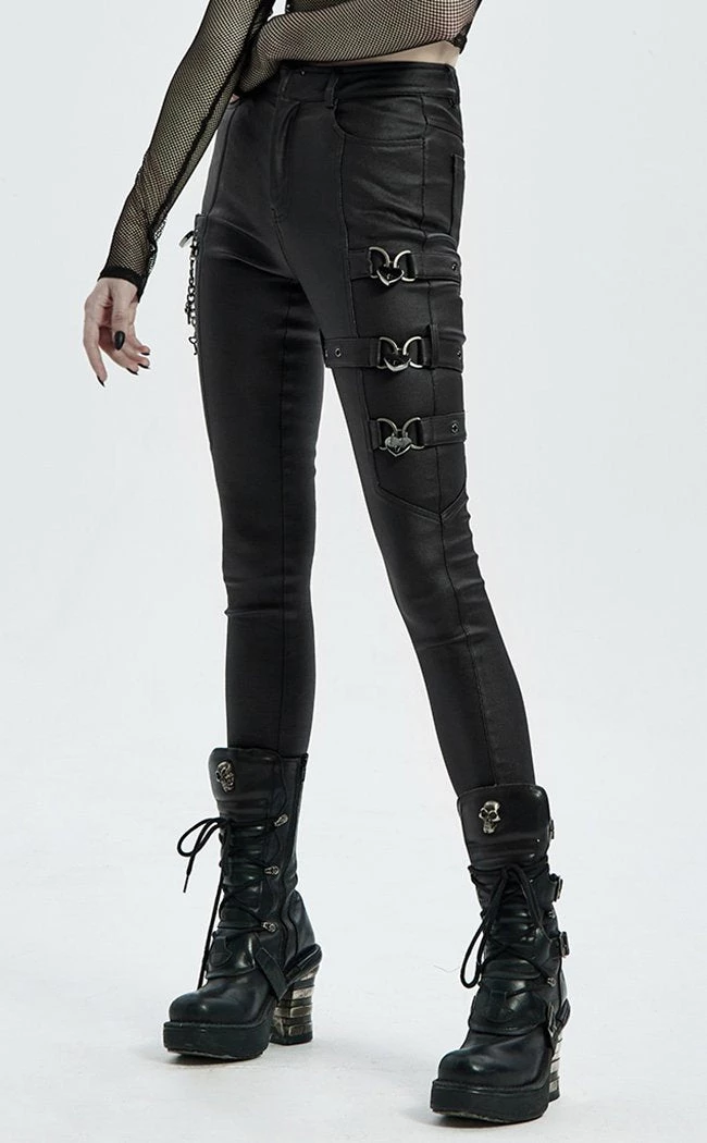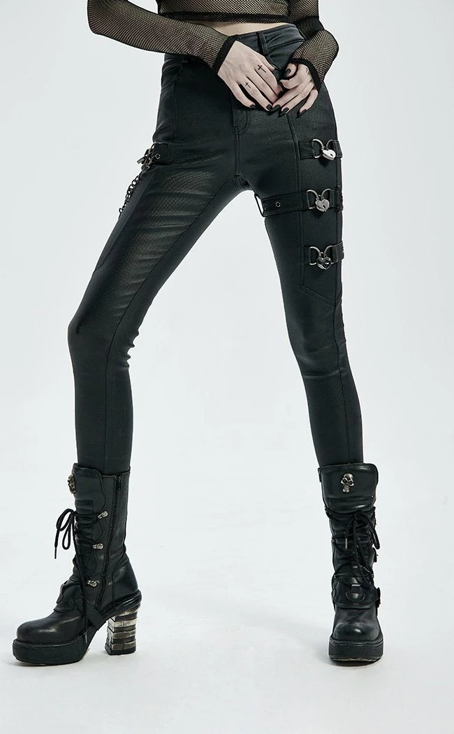 The Gladiatrix jeans are high waisted with a flattering skinny fit and made with sleek faux leather. Badass trims like chains with key charms and heart lock buckles will have you feeling like a punk with a heart of gold.